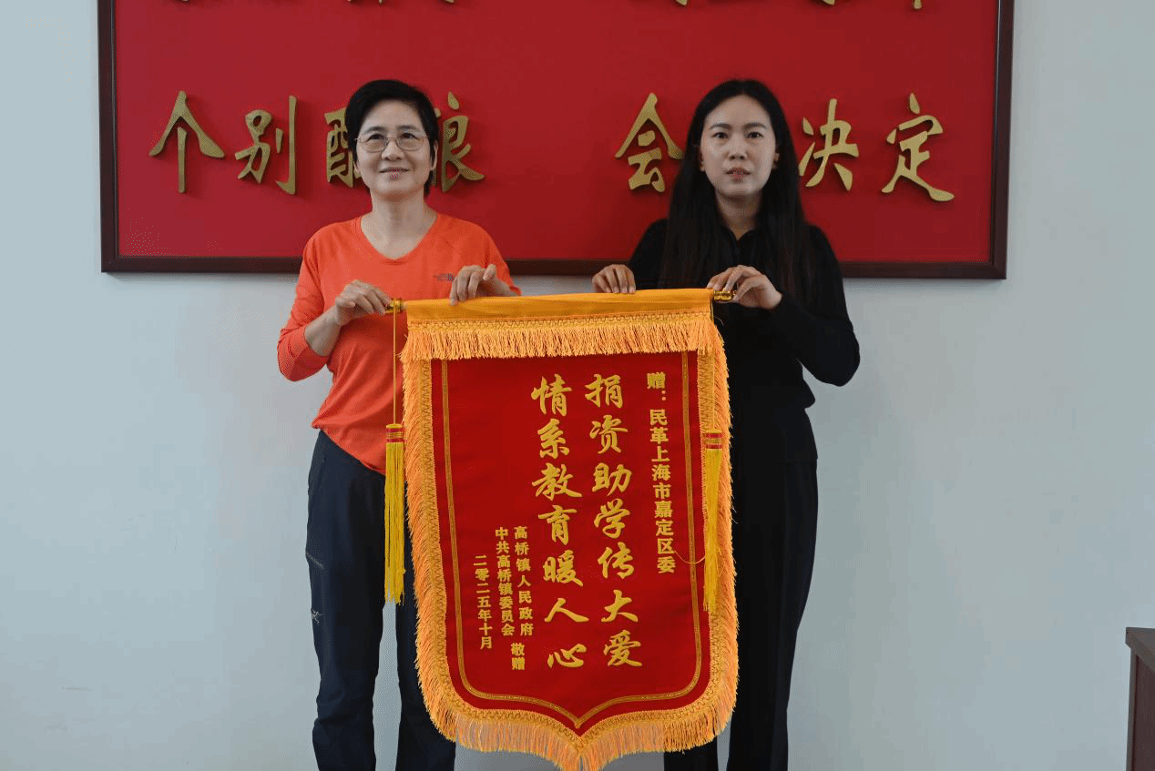 随后,民革上海市嘉定区委向高桥镇困难学生捐赠助学金60000元,高桥镇人民政府镇长王锦艳代表高桥镇困难学生回赠锦旗,表达感激之情。