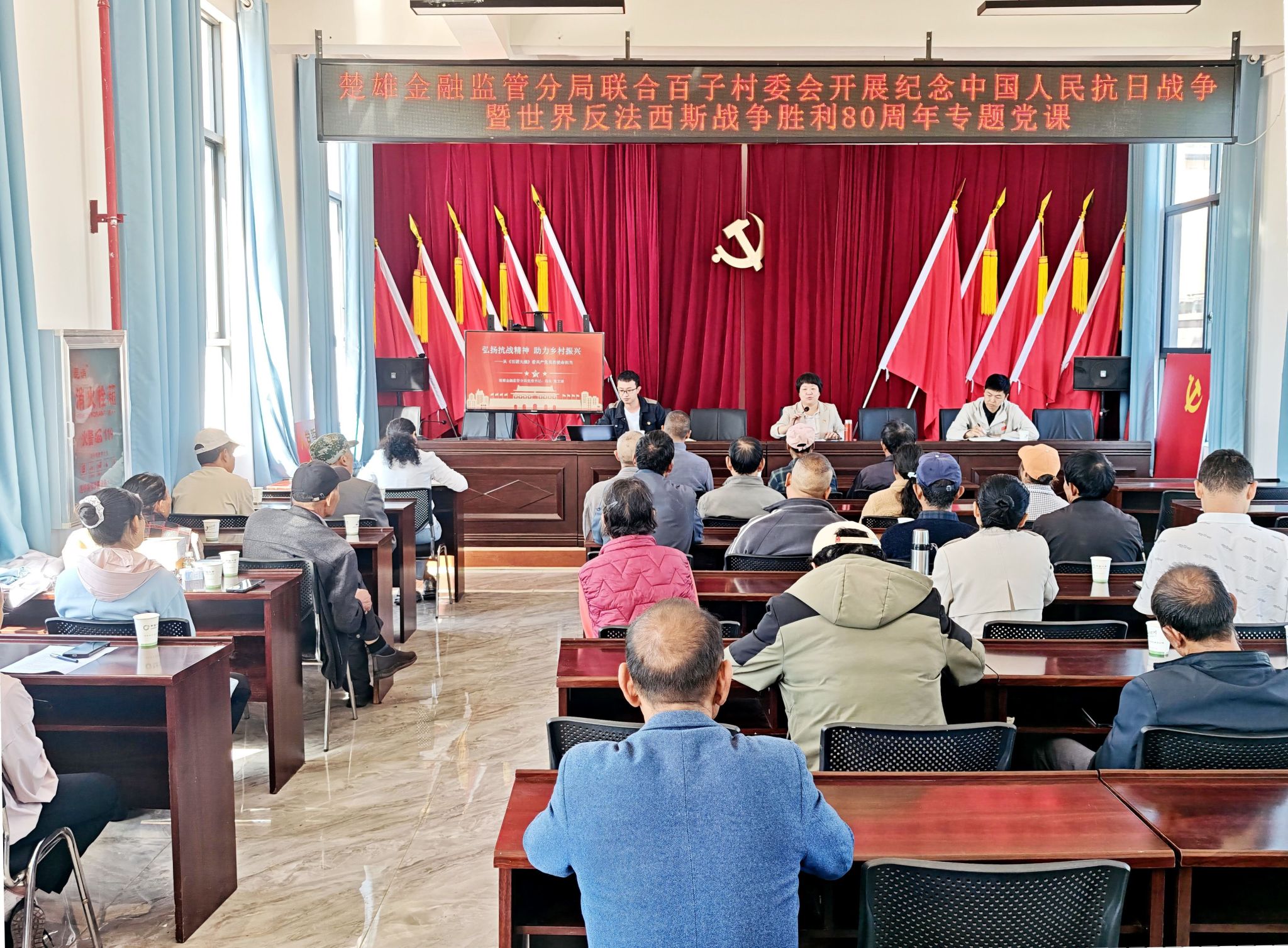 为深入学习贯彻习近平总书记在纪念中国人民抗日战争暨世界反法西斯战争胜利80周年大会上的重要讲话精神,传承并弘扬抗战精神,助力百子乡村振兴工作落实落细。9月25日,楚雄金融监管分局党委书记、局长张文凌率队,携副局长李桂梅及青年骨干共4人赴猫街镇百子村,联合百子村党总支开展纪念中国人民抗日战争暨世界反法西斯战争胜利80周年专题党课活动,并实地走访慰问困难农户。