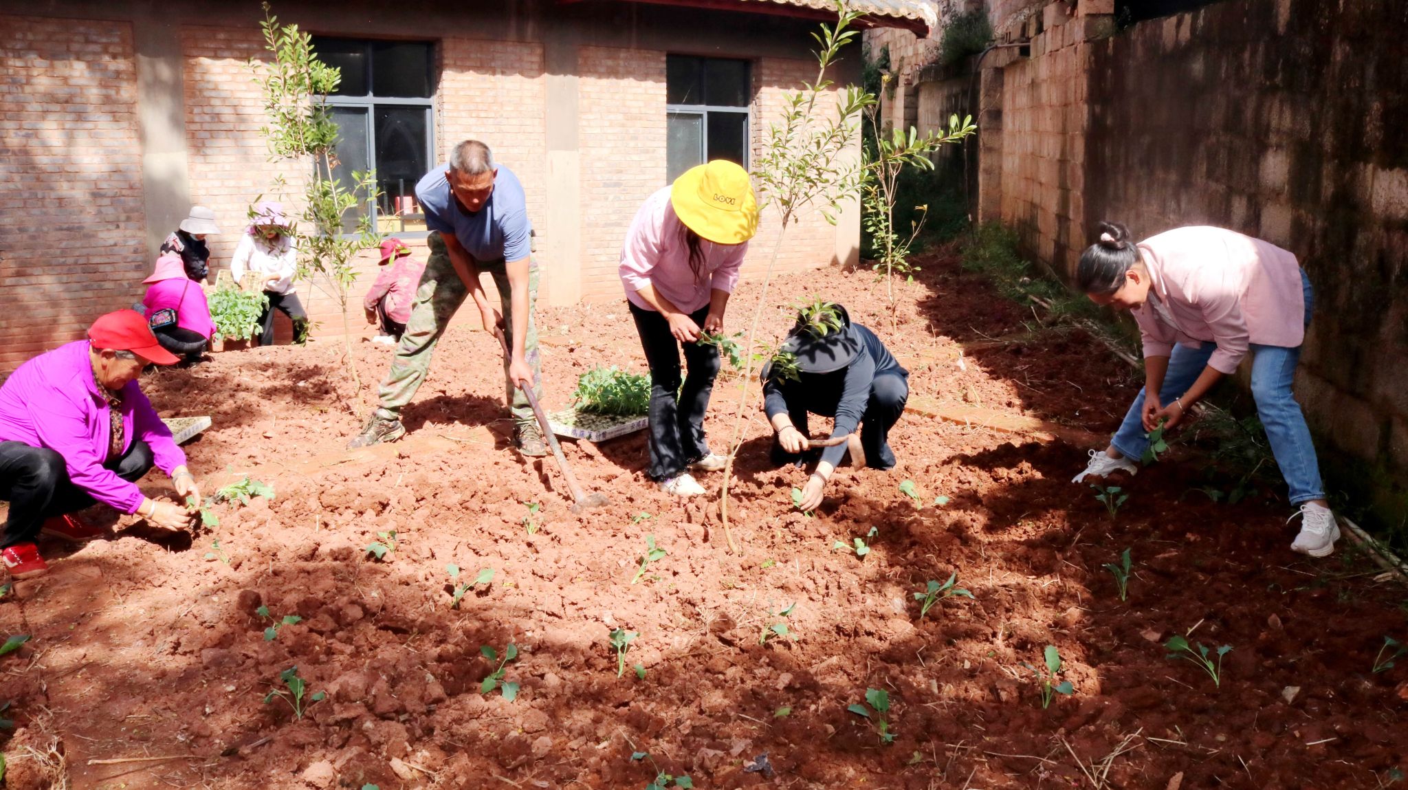 中午12点,金凤村的重阳活动正式拉开了序幕。村里的壮年男女拎着自家种的萝卜白菜、养的鸡鸭,带着米油肉蛋赶来,围在灶台边摘菜、切肉、下锅;志愿者们则围坐在院中餐桌旁包饺子,“你包的快、我包的好看……”互相比着、学着、包着,欢声笑语飘满小院。活动室后院的空地上,志愿者和老人们共同种菜,为金凤村老年食堂种下一排排应季蔬菜,种下同心的期盼。