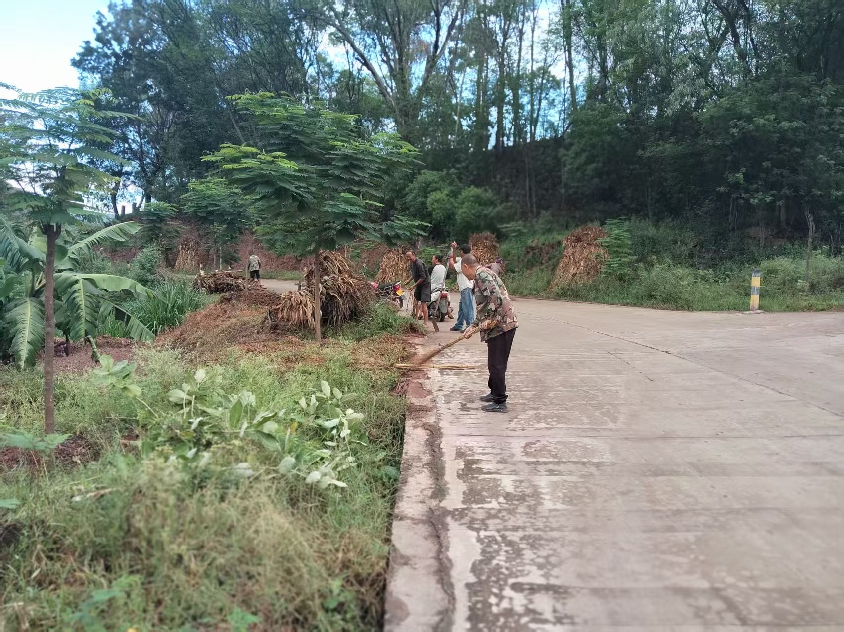 针对这一问题,东坡傣族乡迅速组织人员,采用“机械为主、人工为辅”的协同作业模式推进清理:一组人员操作背负式割草机,对主干道、通村公路的开阔路肩进行高效修剪,刀片过处,杂乱的杂草瞬间被修整得整齐划一;另一组人员手持镰刀、锄头,深入机械难以触及的边坡、路肩缝隙,细致清除盘根错节的杂草杂木,同步弯腰捡拾路面散落的残枝败叶、碎石杂物,确保“路肩无杂草、路面无堆积”。