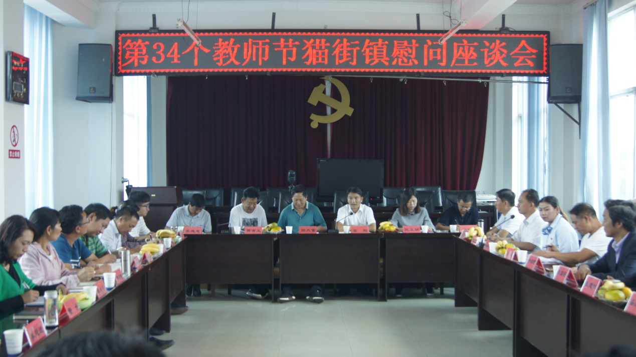 9月7日下午,在猫街镇五楼大会议室召开了“第34个教师节猫街镇慰问座谈会”,县政协主席阳庆富、县委办主任左刚、县教育局副局长阮卫娟、猫街镇全体党政班子成员、猫街中小学校班子成员、优秀教师代表参加了座谈会。