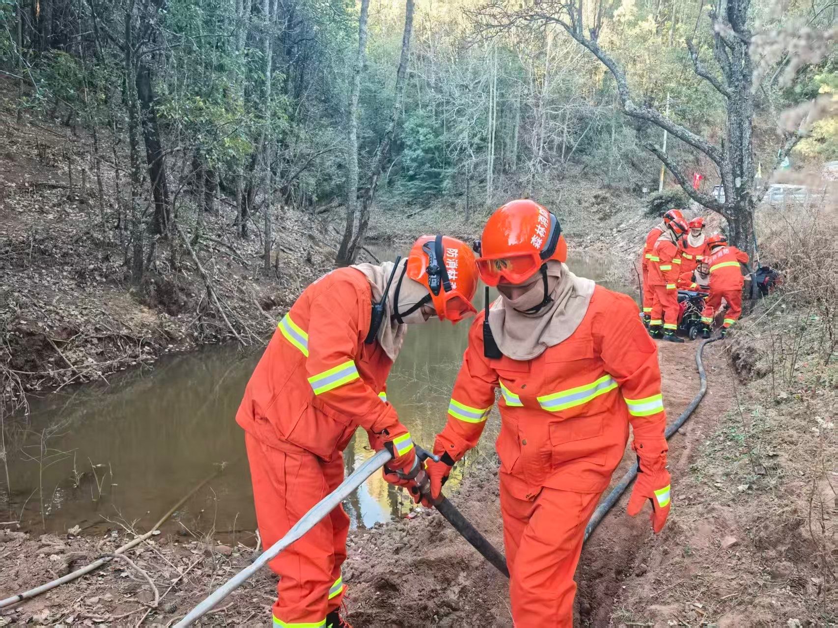 本次演练紧扣春节前森林防火工作重点,坚持“安全第一、贴合实战、协同高效、以练促学”原则,模拟真实森林火灾场景,聚焦水泵架设、水管接入、林火扑灭等核心实操环节科学设科。演练现场成立专项领导小组统筹指挥,划分水泵架设组、水管接入组、扑火攻坚组、现场协调组及物资、医疗、安全等保障小组,明确职责、分工协作,构建起上下联动、快速响应的应急处置体系。