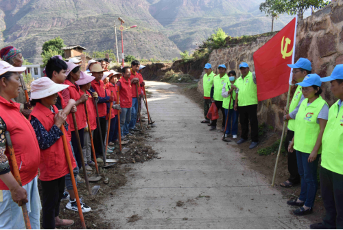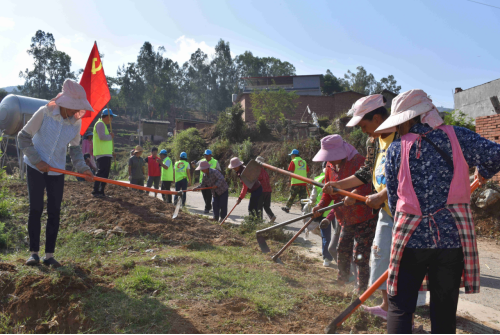乡工作队员、驻村工作队员、村委会干部、党员、群众自带撮箕、锄头、镰刀、三轮车、推车等工具在通往集镇的公路沿线松土、除草、清垃圾,活动中,大家分工明确,有的翻地、有的除草、有的清垃圾,整个活动井然有序。在烈日下,大家边聊天,边擦汗,配合默契,干得热火朝天。
