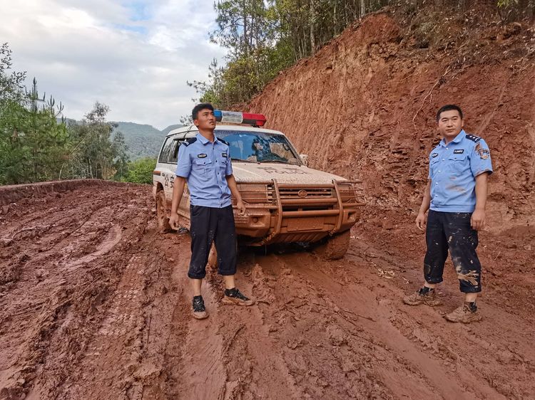 发窝派出所的蓝朋友们顾不上警容是否整齐,撸起裤脚主动上前开展救援工作,拿出自带的钢绳用警车被困车辆一一拉出,一辆两辆三辆……班车拉出来了,小货车拉出来了,私家车拉出来了…民心拉出来了,真正做到心系群众情为民,车上群众纷纷掏出手机记录下这群“警容不整”满身泥巴的可爱蓝朋友。雨在下,发窝派出所忙碌在长己线的救援工作还在继续……