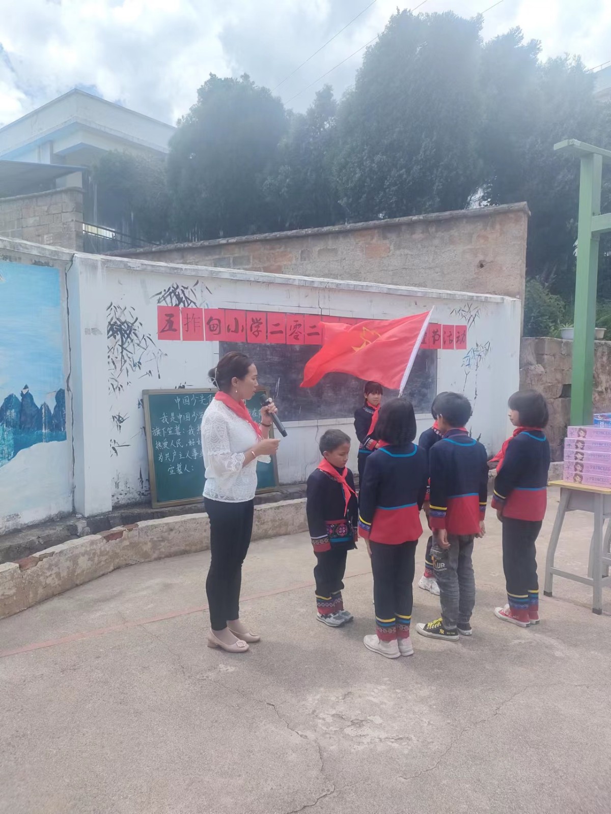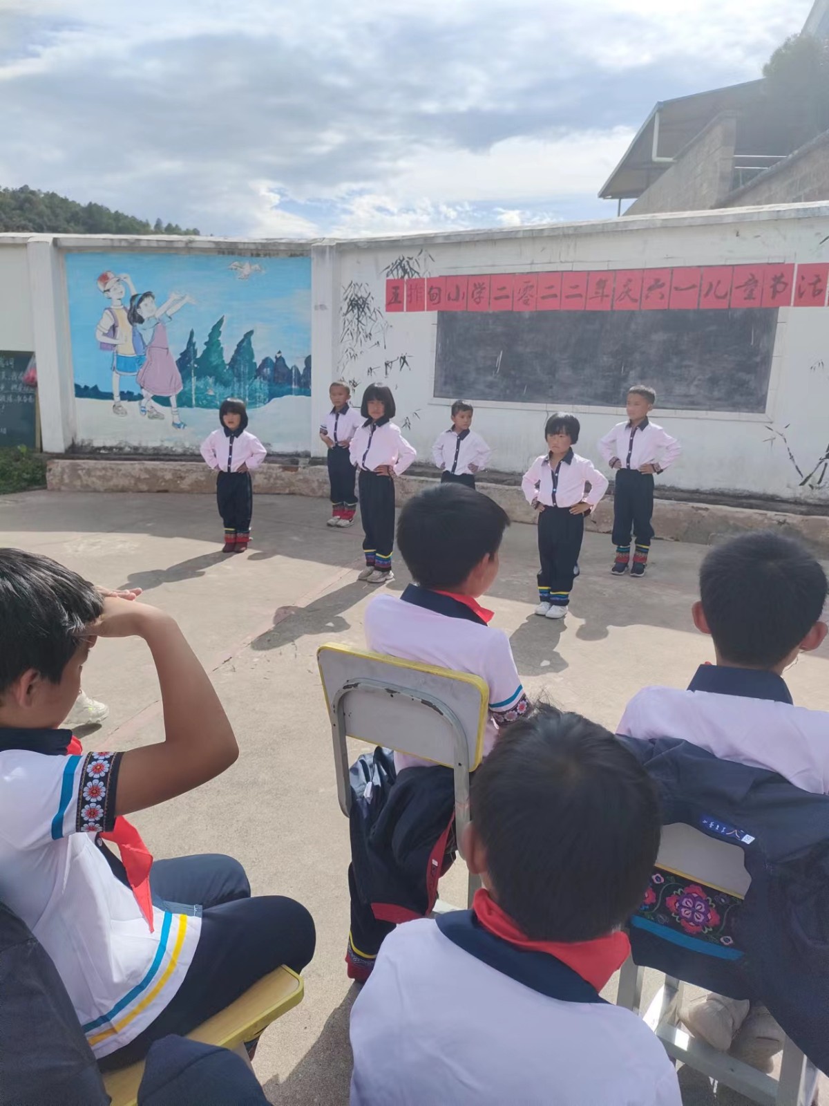 6月1日下午五拃甸村小学队旗飘扬,同学们穿上漂亮的彝族校服,精神饱满与老师们共同庆祝国际“六一”儿童节。