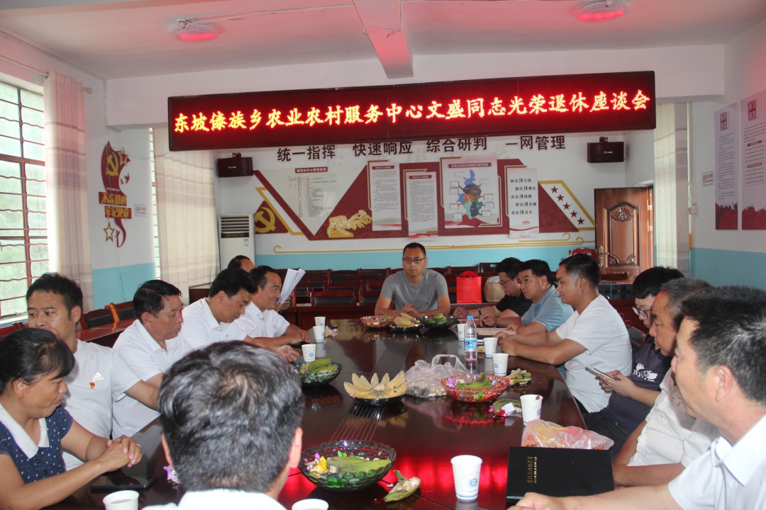 离退休干部是党和人民的宝贵财富,是迈进新征程道路上的重要力量。为充分用好离退休干部这本“活教材”,把离退休干部所蕴藏的正能量与精神品质挖掘好、发扬好、传承好,引导年轻干部传承艰苦奋斗精神、汲取奋进力量,6月1日下午,东坡傣族乡举办退休干部欢送会,欢送文盛同志光荣退休。东坡乡党委书记文建华同志、副书记白云涛同志出席欢送会并讲话。乡人民政府副乡长刘永清同志主持会议,东坡乡农牧党支部全体成员、农业农村服务中心全体干部职工参加欢送会。