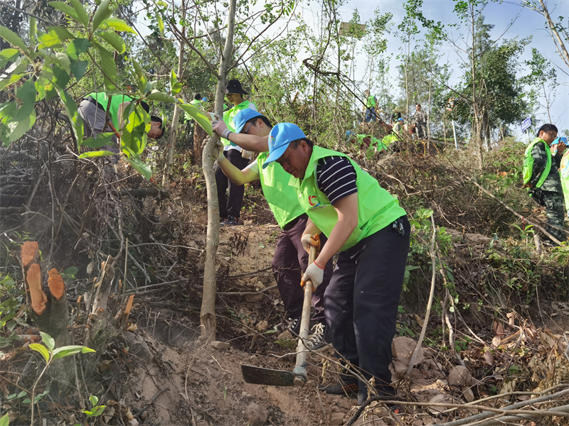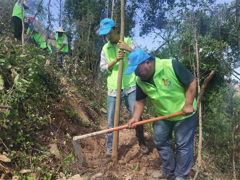 种植现场,干部职工三人一组,挥楸铲土、定点挖坑、放苗填土、浇水挂牌,大家分工协作,干劲十足,植树现场一派热火朝天的忙碌景象,洋溢着团结协作、昂扬向上的融洽氛围。
