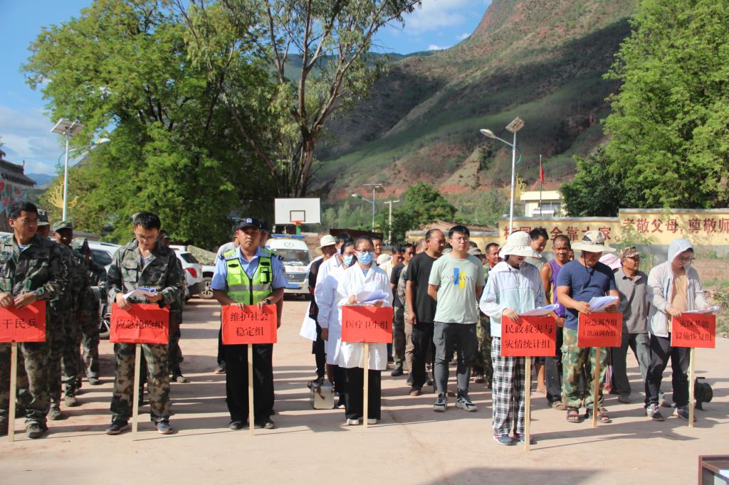 本次活动模拟东坡乡境内发生持续强降雨,遭受山洪、泥石流及地震灾害,地质灾害和山洪灾害易发点万则里村降雨量已经接近预警值,地震震级达到5.6级,严重威胁万则里村75户263名群众生命财产安全。接到险情报告后,东坡乡立即启动山洪灾害、地质灾害和地震灾害应急救援预案,成立总指挥部,调动交通治安组、应急抢险组、医疗卫生组、灾情调查组等8个组赶赴现场实施应急抢险工作,值班监测人员及时拉响紧急转移警报。模拟抢险现场,各组按照分工,各就各位,分别开展了抢险救灾、群众疏散转移、灾区人员排查和维稳、医疗救护、灾区防疫、调运救灾物资等演练项目。