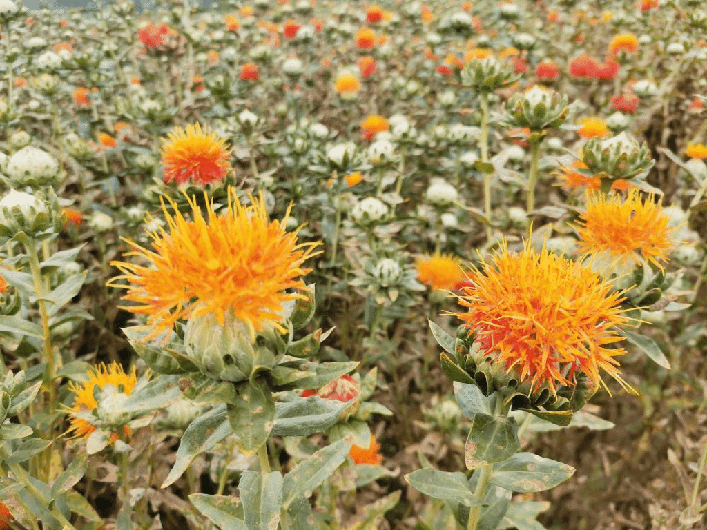滇红花属于是红花科的一种花,在每年的国庆节前10天左右种植,次年上半年采摘红花,经过晾晒之后就可以使用。滇红花含有丰富的亚麻酸、油酸和维生素等,具有安神、补血、祛斑、养颜和缓解痛经等作用,它的茎叶粉碎是很好的家畜饲料。目前在安德村委会种植161亩,目前正值红花盛开时节,成片盛开,形成了一幅美丽的风景。