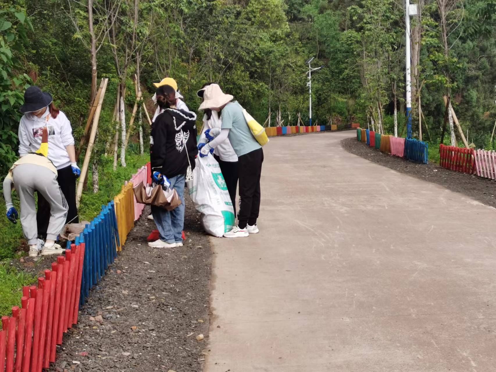 实践团分为两个组分别前往七棵树、桃园两个村开展环境卫生整治和乡村美化绿化工作,干部职工、党员群众、农大学生分组开展,一组进行环境卫生整治,清理路边垃圾以及砖石瓦块,“脏、乱、差”的村庄摇身一变成了干净整洁的画卷;而在另一组,墙已基本刷白,用于墙面点缀的瓦片、老物件、轮胎也已经涂色完成,一个个承载着岁月印记的老物件,或变成了花墙的装饰品,或成了地面上的铺路石,既美化了环境,又延续了记忆。