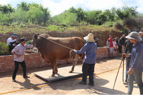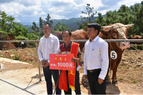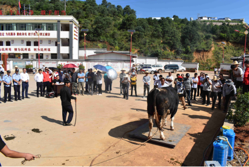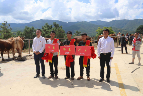比赛现场,围观群众议论纷纷,寻找自己眼中的“牛魔王”。参赛牛在主人的牵引下,依次踏上地磅,在不断的惊呼声中,角逐出一等奖1名,获牛魔王称号,二等奖2名,获牛神称号,三等奖3名,获牛王称号。乡党委书记曹吉,乡党委副书记、乡人民政府乡长杨成武为获奖牛及牛主颁发荣誉证书。