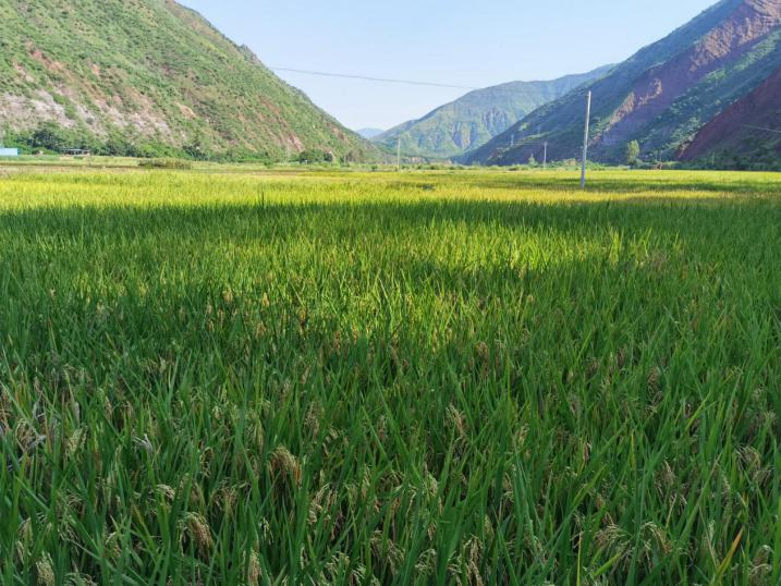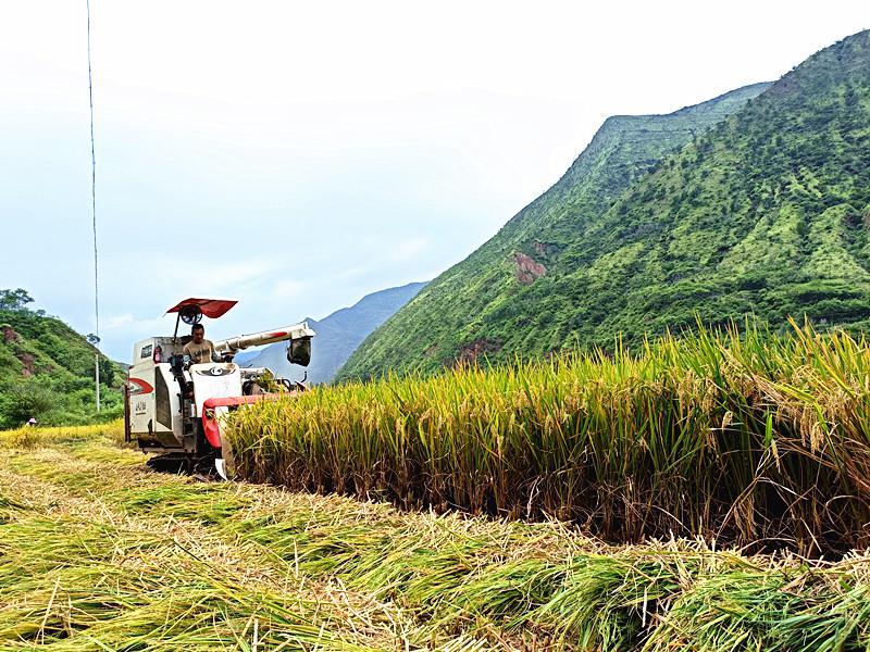 大地金黄,稻浪飘香。在东坡乡所所卡村的稻田里,稻穗沉甸甸垂挂下来,颗颗饱满,粒粒金黄。一台台收割机在滚滚稻浪中来回穿梭,一派繁忙景象,奏响了一曲高昂、热烈的丰收乐章。望着金黄饱满的稻穗,群众的脸上洋溢着丰收的喜悦。