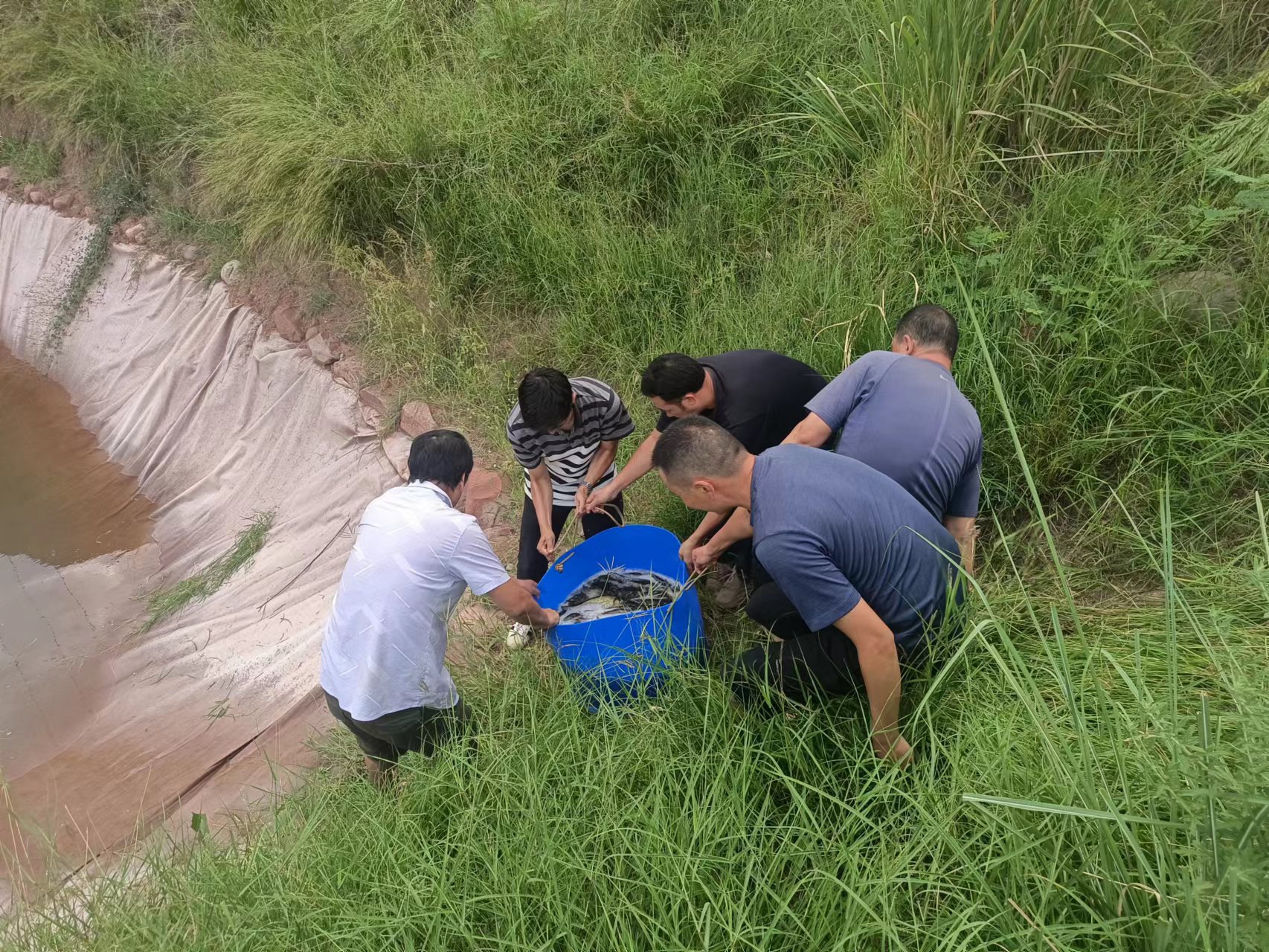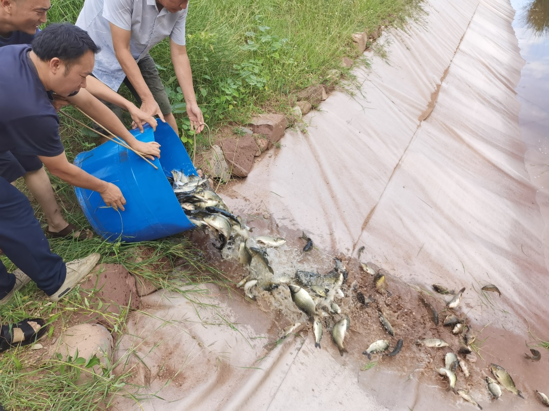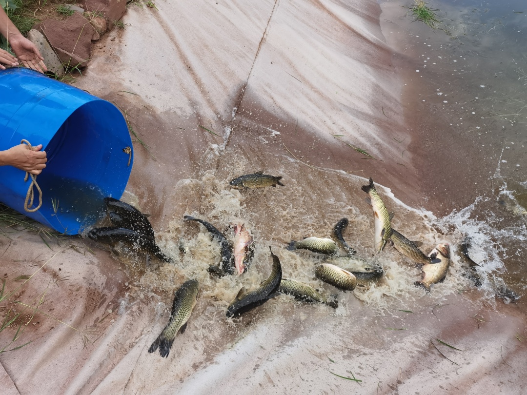 8月31日傍晚,300公斤大大小小的鱼儿“排队”搬入新家,或飞身一跃,或迅速游走,矫捷的身姿吸引着岸上众人的目光。乡、村工作队员与驻村工作队员互相配合,没一会儿,鱼儿就全部被投入鱼塘内。