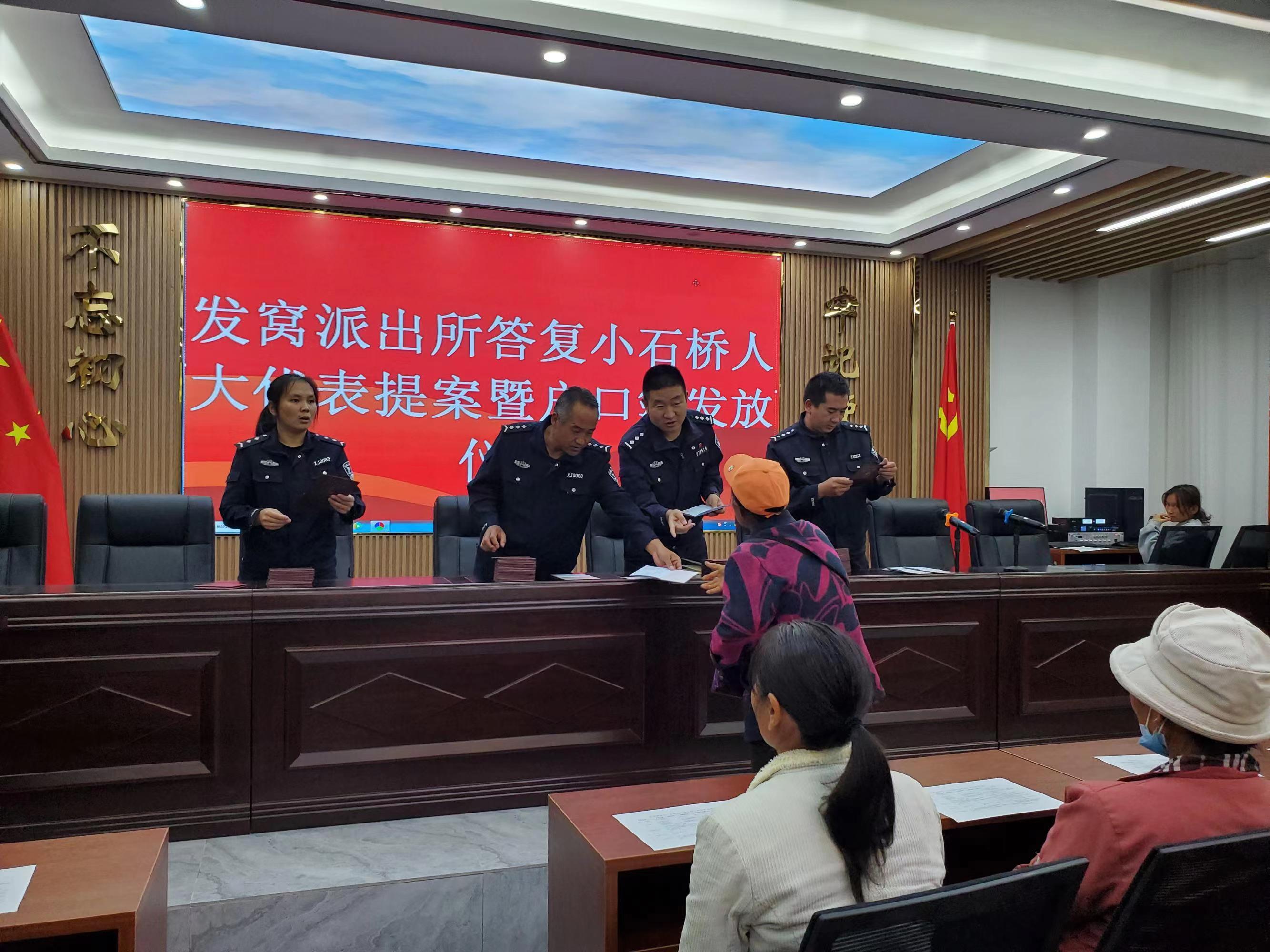紧接着,发窝派出所结合我为群众办实事活动,针对近期因新组建小石桥村委会户籍散乱,从而造成学生上学、外出工作不便等问题,主动作为认真履职,安排专人按有关程序开展户籍变更,并统一打印户口簿上门发放,切实用实际行动把“急难愁盼烦怨”问题解决在群众心坎上。