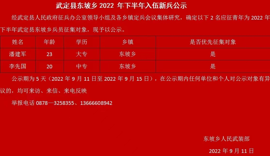 今年来,为激发广大适龄青年参军热情,动员更多的优秀青年报名应征入伍。东坡乡通过召开征兵动员会,精细摸排各行政村适龄青年、大学在校生、毕业生,发放宣传资料、微信动员等形式加大征兵宣传力度,确保征兵信息政策家喻户晓、人人皆知,全力做好秋季征兵宣传动员工作。据悉,今年秋季,东坡乡共有2名青年参军入伍,其中1名来自水口村、1名来自所所卡村。
