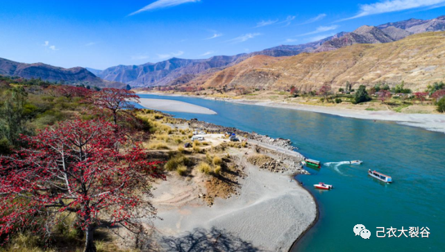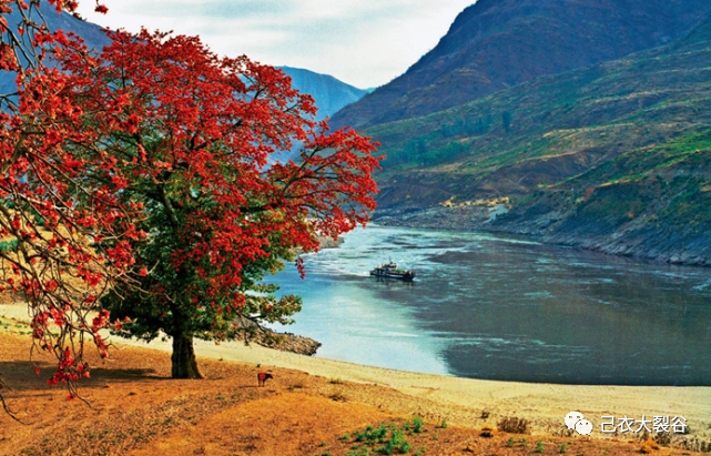 波涛汹涌的金沙江,在 己衣境内保持着难得的平静与祥和,无疑是对己衣最美好的馈赠。春天,盛开在江两岸的攀枝花和红色的土壤岩石,满江红遍,加之碧蓝蓝的江水、绿油油的冬早果蔬、青山白云蓝天,犹如童话般的优美;夏天,绿铺大地,山云吐翠、云雾缭绕,庄稼、树木,一片生机勃发;秋天,大地一片金黄,瓜果遍地,欢声笑语,到处是丰收的景象;冬天,烟雾弥漫的江面,枫叶红遍的山间,白雪飘飞的山头,蓝天白云相映生辉,天地一片苍茫。