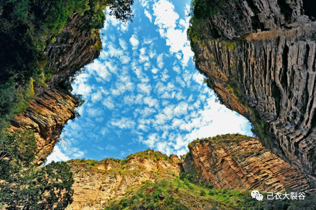 己衣大裂谷从己衣镇南面海拔2900米的大黑山一路欢快奔向海拔862米的老村村口金沙江,全长30公里,集雄、险、奇、秀于一身。红色岩石层层叠叠,如城堡般屹立于山谷中,裂谷两侧悬崖峙立,古木参天、山花烂漫,实在叹为观止、美不胜收。峡谷最深处300多米,最宽处约200米,最窄处仅6米。