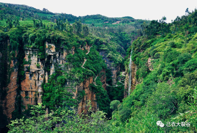 夏天,己衣大裂谷的岩层上会开出各种娇艳的花朵,让人浮想联翩。己衣还有属于自己的红色故事。在 己衣大裂谷的悬崖峭壁上悬挂着一条己衣儿女的生命线,即己衣大沟,也被后人誉为“己衣红旗渠”,可谓悬崖上的“天沟”。