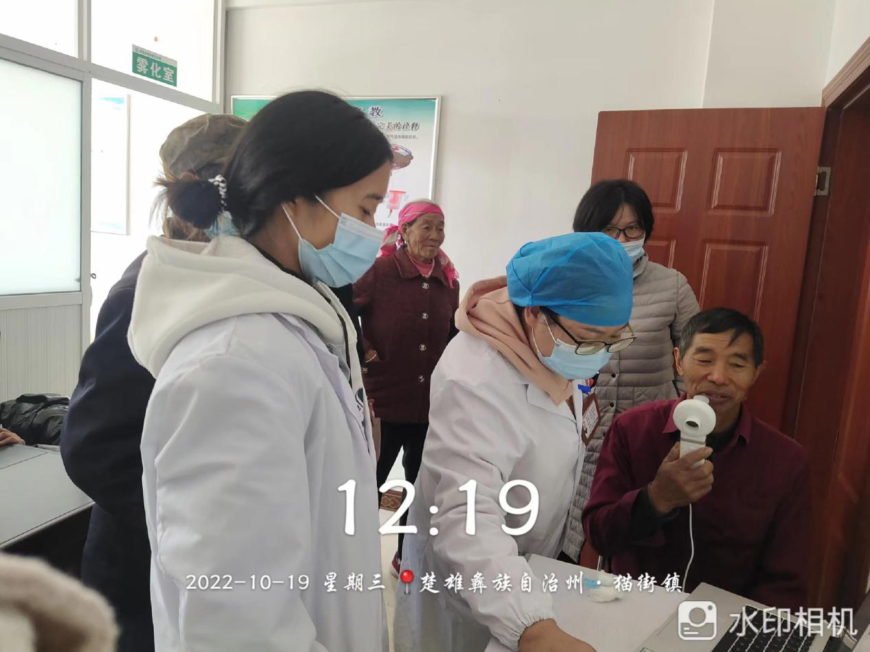 “来,挺胸坐直,吸气吐气,吸气吐气,大口吸气,然后用最大力气将气体全部呼出,中间不要停顿......”。在猫街镇卫生院慢阻肺疾病筛查室内,科室主任董星池医师在为50岁以上长期吸烟男性以及有高风险的患者进行肺功能检查。
