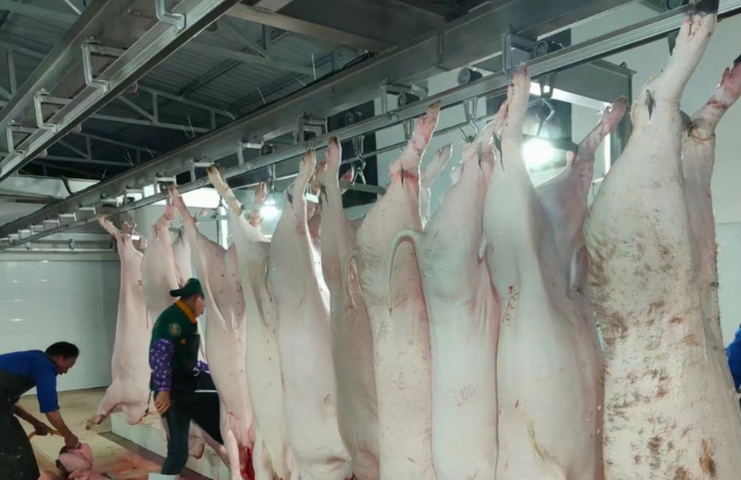 “宰杀一头生猪,经过电击麻醉、套脚挂钩、刺杀放血、机械打毛、剖腹劈半等多道屠宰工序,只用十分钟。”屠宰场负责人孙宏任介绍说。