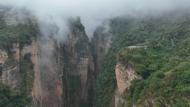 己衣大裂谷被誉为“滇中第一大裂谷”,是藏在武定大山里的一处奇景,沿线山川像被刀劈开,两边绝壁几乎呈90度垂直而下,露出层层叠叠的岩石断层,陡峻的山峰下,大裂谷深不可测,是国内难得一见的地质奇观。