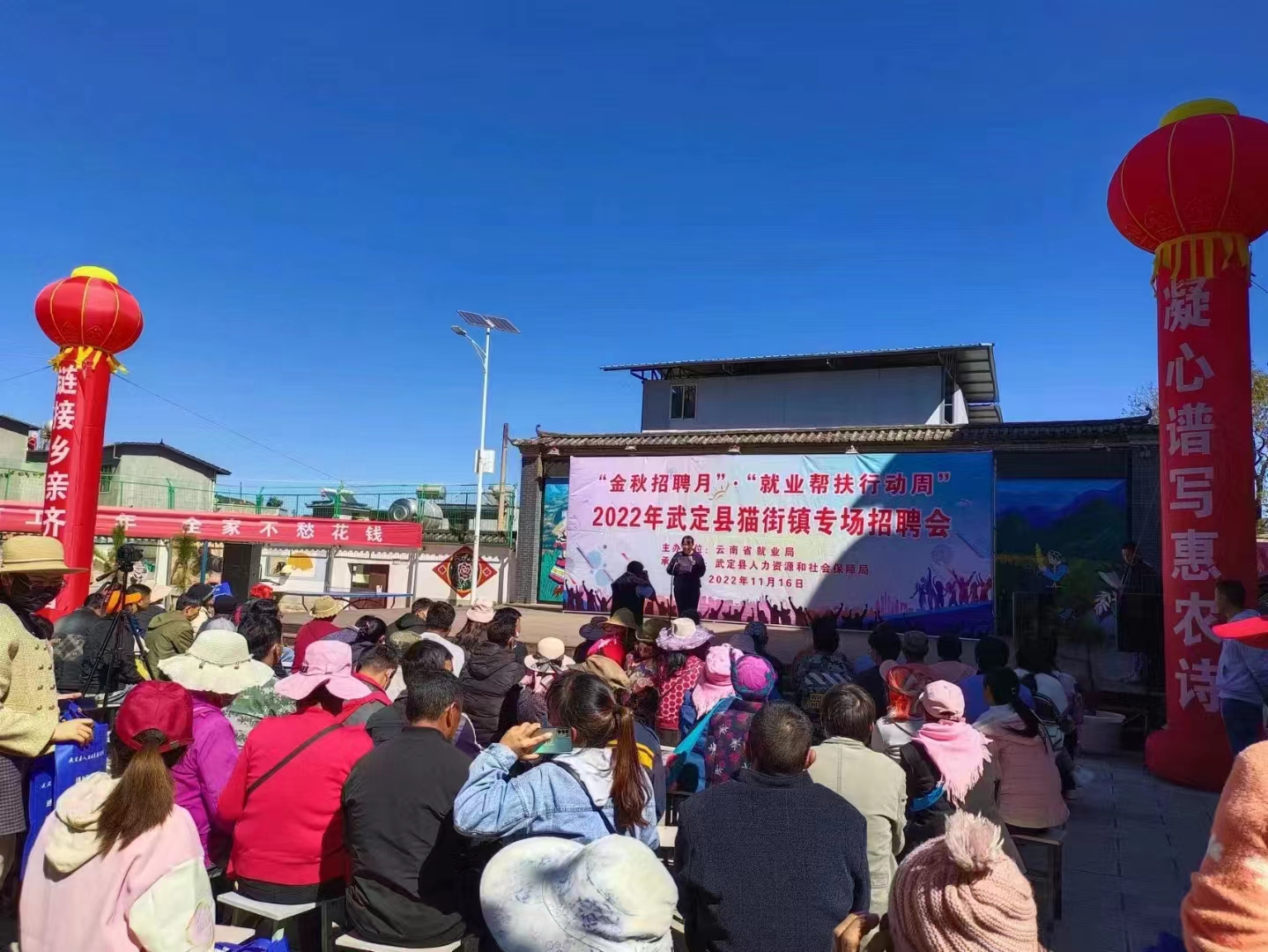11月16日,云南省就业局联合武定县人力资源和社会保障局在武定县猫街镇举办“金秋招聘月”“就业帮扶行动周”招聘会,借助此次招聘活动契机,猫街镇积极配合主办单位和承办单位,在辖区十五个村委会大力宣传招聘活动及就业相关政策。通过采取进村入户走访、赶集日发放宣传单、短信信息推送、微信群信息推送及“送戏下乡”活动等宣传方式,把就业援助优惠等政策和招聘活动信息进行全面宣传,多渠道把把政策宣传到群众心里、把招聘活动信息传到群众耳里。
