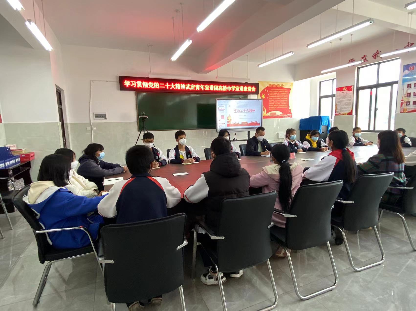 为深入学习贯彻党的二十大精神,引导广大青少年坚定不移听党话、跟党走,11月20日,武定县青年宣讲团副团长、共青团武定县委书记王庭振走进高桥中学,组织青年学生开展学习贯彻党的二十大精神武定青年宣讲团高桥中学宣讲座谈会。王庭振采用“理论讲解+心得分享+现场问答”的形式,将贯彻党的二十大精神与“青年工作”“争做新时代好少年”相结合,进行了系统阐释和深入解读,座谈会现场气氛热烈。