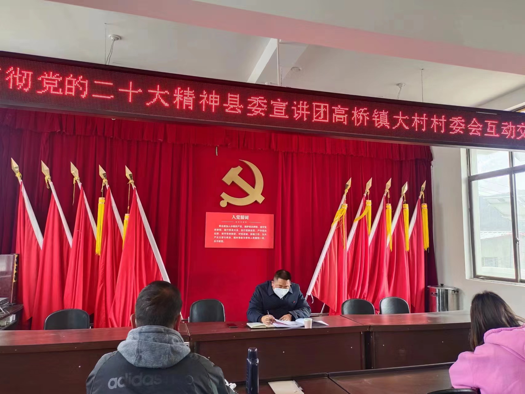 12月20日,学习贯彻党的二十大精神武定县委宣讲团基层互动交流活动走进高桥镇大村村委会,县委宣讲团成员、高桥镇党委书记李长清到大村村委会与基层干部群众进行互动交流。活动现场,互动踊跃,气氛热烈。李长清以大家关心关注的热点问题为切入点,结合自身学习体会、高桥经济发展实际和村委会治理工作,把“书面语”变成通俗易懂的“家常话”,用生动的语言把讲道理、讲故事、讲事实结合起来,围绕学习贯彻党的二十大精神进行宣讲。