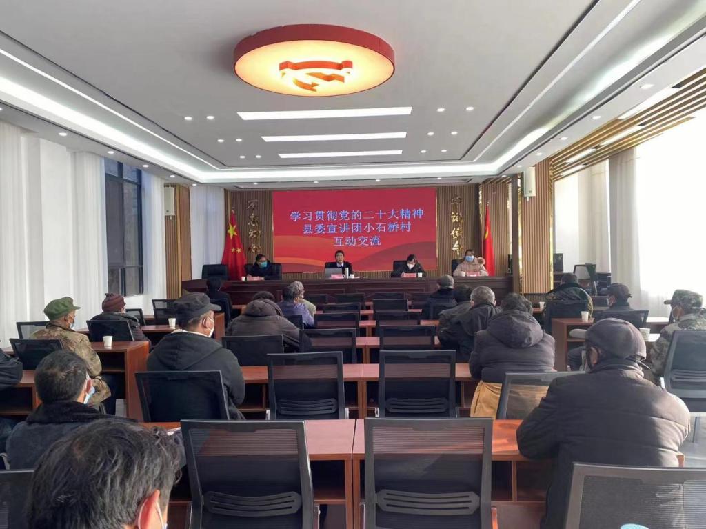 宣讲会上,李华围绕党的二十大精神并结合小石桥村委会的成立及发展变化,对党的二十大精神作了系统宣讲和深入阐释。围绕群众关心关切的问题,用一组组数据列举了脱贫攻坚以来小石桥村委会的巨大变化,建成了通村公路并向田间地头延伸,告别了人背马驮的时代。家家户户通上自来水,解决了群众吃水难的问题。配套建设村级卫生室,实现小病小痛在家门口就能看。同时,作为少数民族地区,针对小石桥村实际,就如何学习宣传好、贯彻落实好党的二十大精神提出了要求。