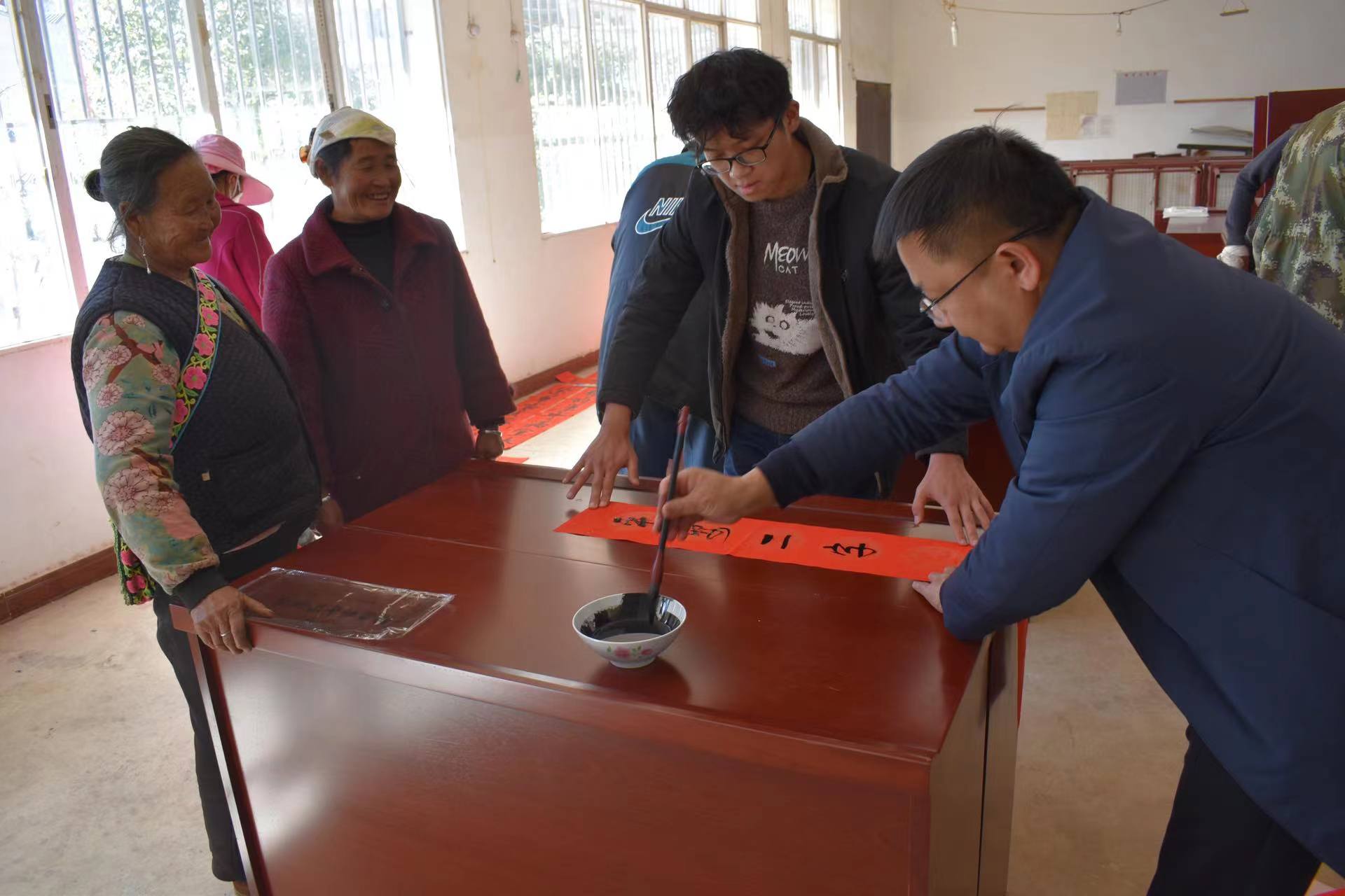 同时,在大麦地村委会活动室,楚雄州人社局举行了写春联送祝福活动。州人社局调研员白惠能、社会保险中心副主任毕鸿文到现场泼墨挥毫,将祝福赋诸笔端,送给乡亲们真诚的祝福,祝福他们阖家团圆,幸福健康。乡亲们拿着寓意喜庆、饱含祝福的春联,喜笑颜开。活动现场热闹非凡,年味十足,共写送春联100多副。