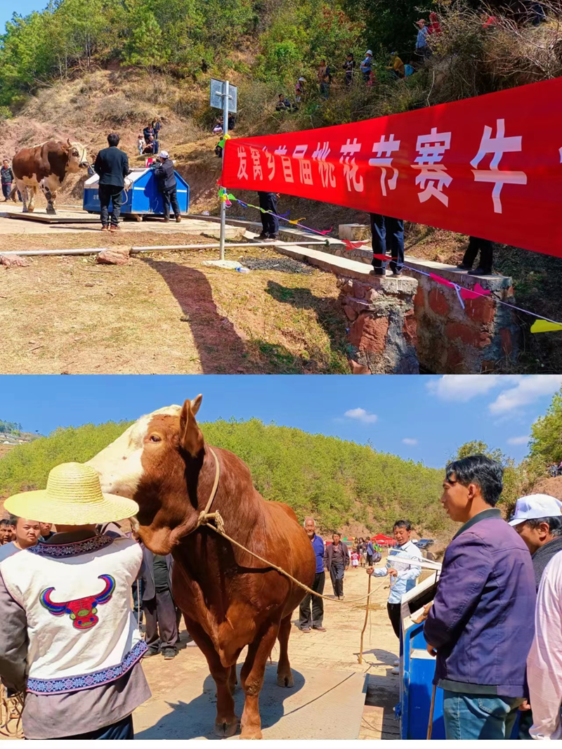 为不断推动发窝乡肉牛产业高质量发展工作,我乡依托武定县肉牛产业“牛七条”扶持政策,积极为牛农“搭牛台”、“鼓牛劲”。2023年3月8日,发窝乡举办首届桃花节赛牛会活动。来自全乡12个村委会及周边乡镇的养牛爱好者将所养殖的大牛拉到赛牛会活动现场,在现场工作人员的引导下,40多头黄牛在牛主的牵引下,逐一上称过磅,称重角逐,体重最大者获胜。