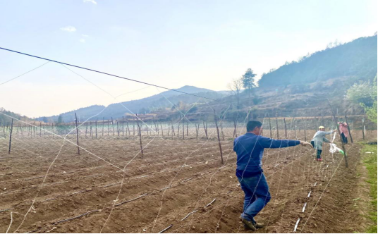 春风送暖,万物复苏。在插甸镇和尚庄村的土地埂子里,张学华一家抓住春耕的尾巴,正忙活着给他家的“致富宝”——白玉山药拉网搭架。两人栽桩,一人拉网,再蹲下来逐一仔细固定网绳,所有动作在密切默契的配合下一气呵成,供山药藤攀爬的网架井然有序地铺设成型。