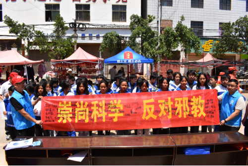 启动仪式现场通过悬挂标语、发放宣传资料等形式多样的反邪教宣传教育活动,气氛十分活跃,吸引赶集群众驻足观看,志愿者边向群众发放反邪教宣传册边讲解邪教危害。现场还设置了固定区域,由专门人员解答群众提出的问题。