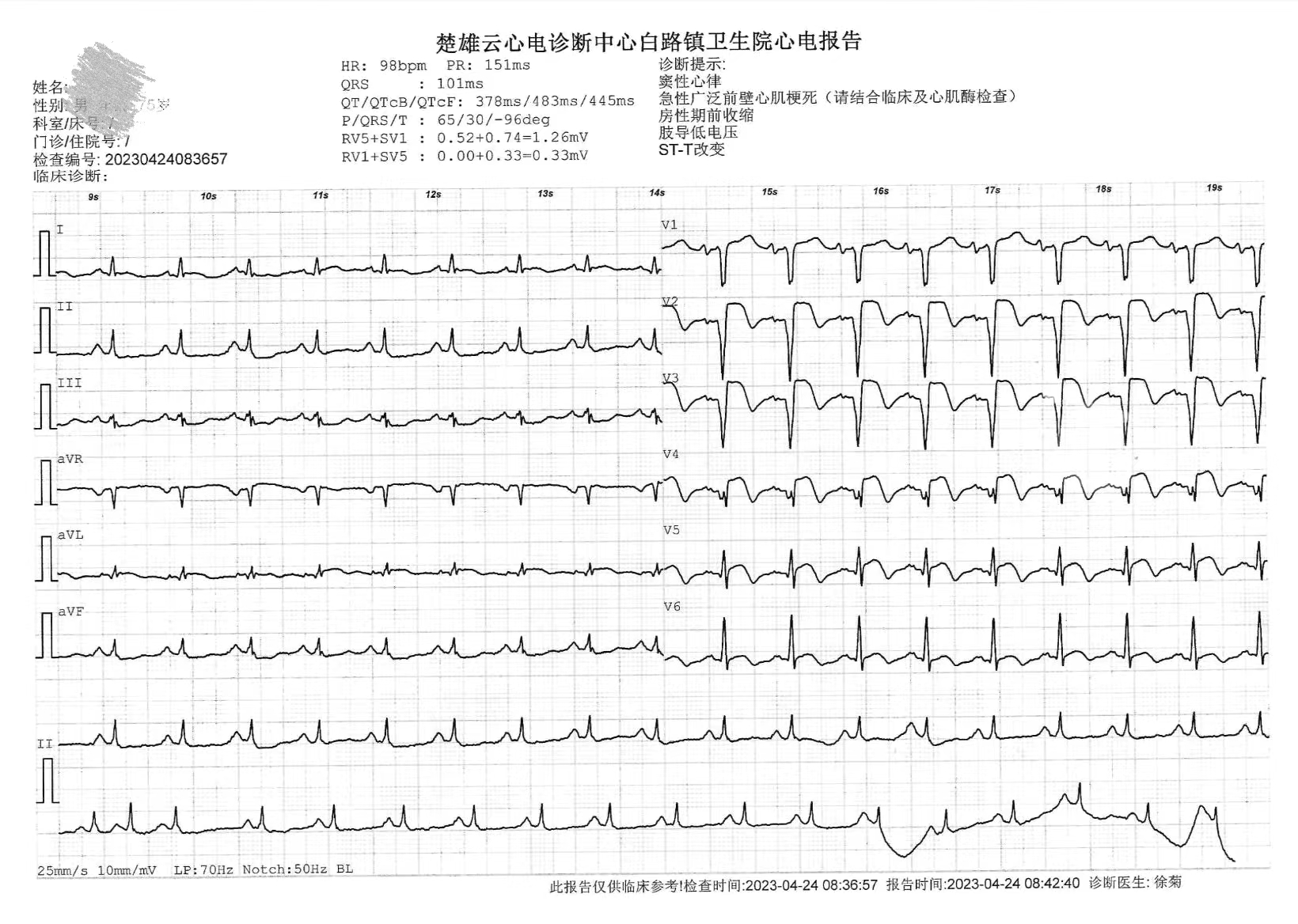 患者因“胸痛、胸闷4小时”自行来诊,08时36分行首份心电图检查,08时42分首份心电图诊断为(危急值):窦性心律,急性广泛前壁心肌梗死,房性期前收缩,肢导低电压,ST-T波改变。08时38分抽血完成行心肌三项检测,08时55分结果回报:cTnI:12.76ng/ml、CK-MB:108ng/ml、 Myo:412ng/ml,D-二聚体:0.9mg/l,电解质:钾离子:3.21mmol/l。考虑:急性广泛前壁ST段抬高型心肌梗死,在武定县人民医院急诊科主任李菊华主任及心内科罗勇主任指导下排除禁忌症后于08:45给予“心梗一包药”。签署溶栓知情同意书后于08:55开始给予“0.9%氯化钠注射液100ml+注射用尿激酶150万单位静脉滴注 60滴/分”进行溶栓治疗,09:15溶栓结束,溶栓过程顺利,患者未出现不适。随后,由我院救护车转昆明920医院,并及时为患者实施PCI术,目前患者病情稳定。