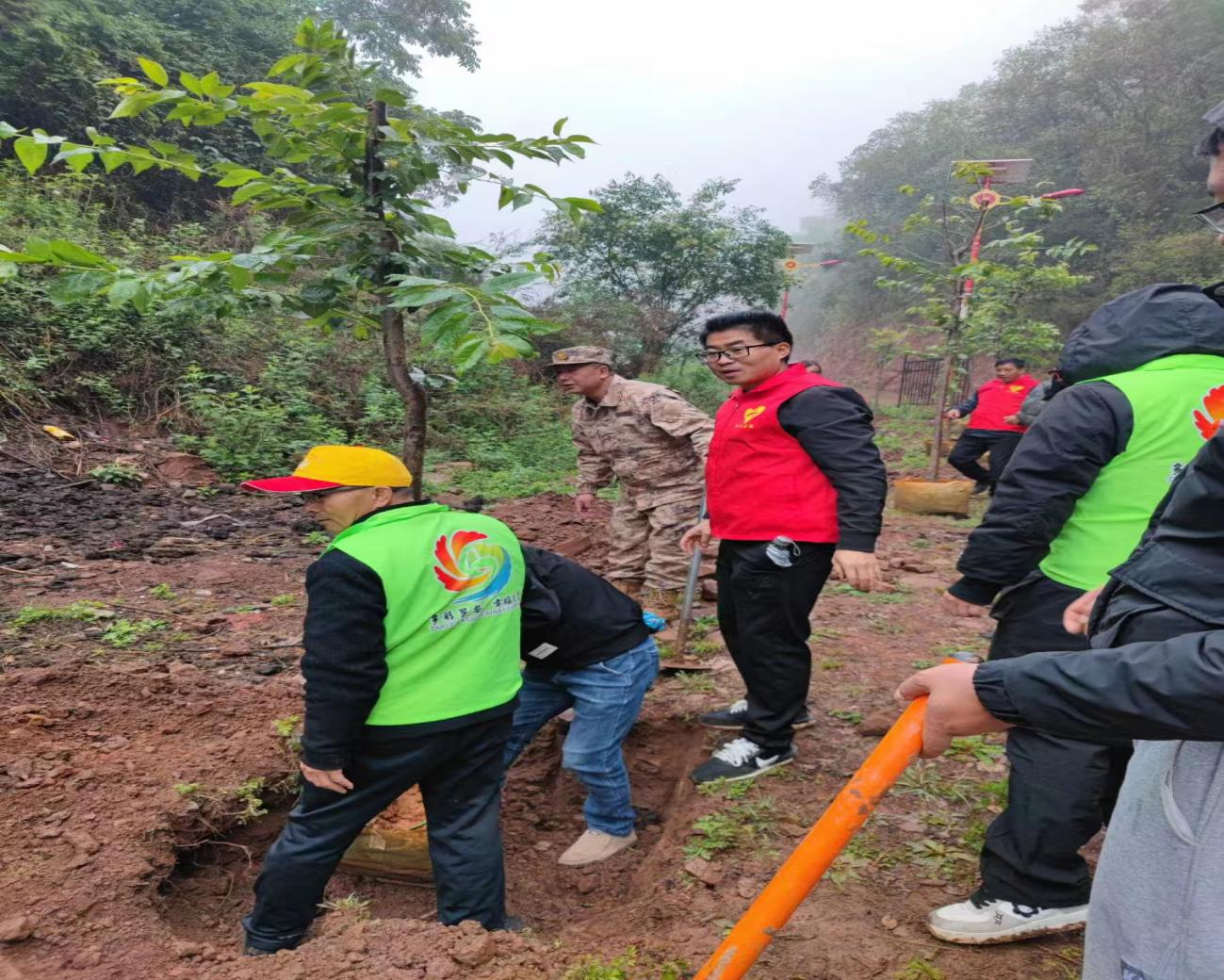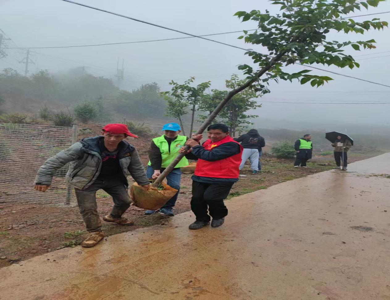 今天的主要任务是在基丁普村的进村道路两旁栽种60株樱花树和在斗牛场旁边的斜坡上运用色彩鲜明的园艺花木栽种出“基丁普村”的村名。全体成员拉线的拉线、挖坑的挖坑、移树的移树、抬土的抬土、栽花的栽花、盖土的盖土、浇水的浇水,大家干得热火朝天。天气寒冷,天空下起了濛濛细雨,但大家并没有停止手里的工作,脚上的稀泥越粘越厚,他们有的满头大汗,有的衣服湿透,有的手上磨起了水泡也没有半点怨言,越干越有劲,直到把所有的花和树都栽种完毕。