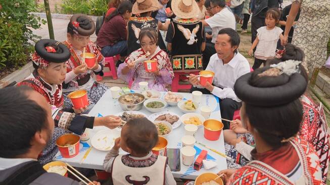 在发窝乡养马场村举办的长街宴,宴席从村头延续近村尾,客人们和当地村民欢聚一堂,一边品尝民族传统美食、一边高谈畅饮,现场满是欢声笑语。