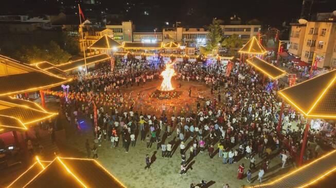 夜幕降临,篝火燃起,熊熊的火焰照亮了整个广场,也点燃了各族群众和游客的热情,男女老幼围着篝火跌脚狂欢,欢歌笑语,现场一片欢乐祥和的景象。