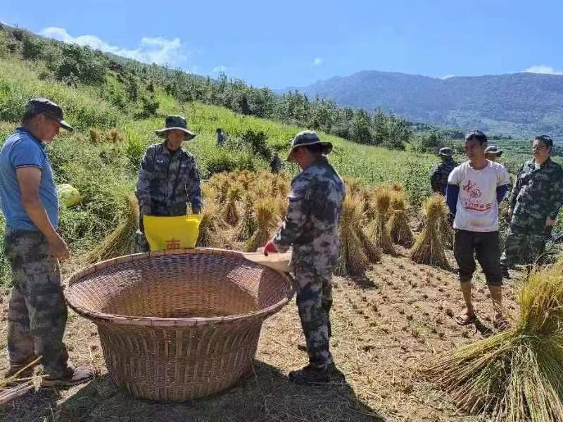 近日,路己荒坡开辟出的稻田迎来了丰收。9月14日,自乌村党总支组织干部群众20余人前往收割,由于是荒坡临时开辟的稻田,机械无法到达,一行人便顺着山脊用镰刀开辟出了一条临时通道。趁着清晨凉爽,大家戴上手套、拿起镰刀就开工。年轻人负责收割、装填、搬运;中老年负责剥离、捆绑;村委会女干部也不逊色,不仅在村务工作中是一把好手,干农活也不含糊。大家一刻也不敢停歇,忙碌了两三个小时终于完成了收割工作。