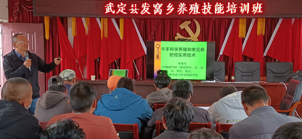 培训班上,云南农业大学动物医学院教授杨建发围绕牛羊科学养殖和常见病防控实用技术为主题,从养牛概述和品种、营养与肉牛饲草饲料、肉牛饲养管理技术、肉牛常见疾病诊治技术、肉牛常见疫病防治技术等知识进行了讲授。在培训过程中,学员们认真听讲、认真做笔记、主动与老师交流互动,课堂氛围良好,学员们受益匪浅。