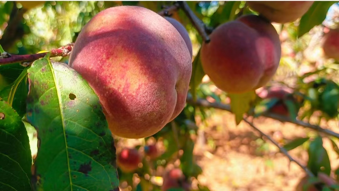 满山的桃园里,桃叶还郁郁葱葱,桃香却阵阵扑鼻而来,健壮的桃树上,一个个粉红的冬桃缀满枝头,农户和游客在桃园里来回穿梭,忙着采摘果子,忙着拍视频,发抖音,一派繁忙丰收的景象。放眼望去,满山桃树上的桃子粉红粉红的,成熟的冬桃你不让我,我不让你地挤挂在枝头,还有一些害羞的躲藏在茂密的枝叶间,煞是诱人。漫步在桃园里,处处可闻甜蜜的果香,随手一摘,便是一个比拳头还大的冬桃,咬上一口,汁多味浓,清脆甘甜,让人完全停不下来。