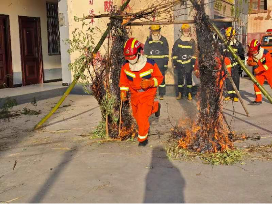 坚持从严从难标准,科学设置训练场地,在东坡乡综合应急救援大队院内用木棍树枝搭建好火门,模拟穿越火门、跨火堆等火种环境,通过模拟训练帮助消防员克服火场焦虑、惊慌、恐惧等不良心理反应,锻炼消防员面对火情时的心理素质,提高火场心理适应能力,特别是遭遇险情时的心理应激和承受能力以及临机处置能力。