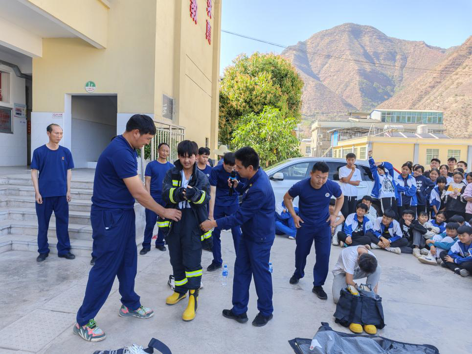 理论培训结束后,李杰队长又向师生介绍了民房消防和森林火灾中常用消防设施器材及防护装备知识,展示消防战斗服原地着装,并邀请同学参与体验。多名应急救援队员向师生展示风力灭火机-水枪协同作业,让师生在校园内就能学习到森林草原灭火知识。