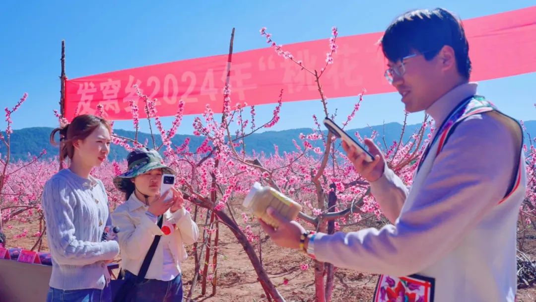 “大家现在看到的是我们发窝乡的山猪火腿,放养在高山一年以上的生态猪,它们吃的是中草药,喝的是山泉水,睡的是松毛席,住的是天然氧吧……”近日,武定县发窝乡代家村500余亩桃花开得正盛,一个由返乡大学生组成的直播小队正在桃林直播,主播刘学林正在介绍核桃油、土蜂蜜、地莲花等农特产品,幽默风趣的语言吸引了不少粉丝前来互动,直播间人气不断攀升“这是我们第二次返乡带货,今年2月,在团县委的支持下,我们在武定狮子山帮助农户以直播+短视频的形式销售农特产品。当天直播商品曝光量达1.7万,线上线下销售额达9295元。”返乡大学生刘学林介绍。