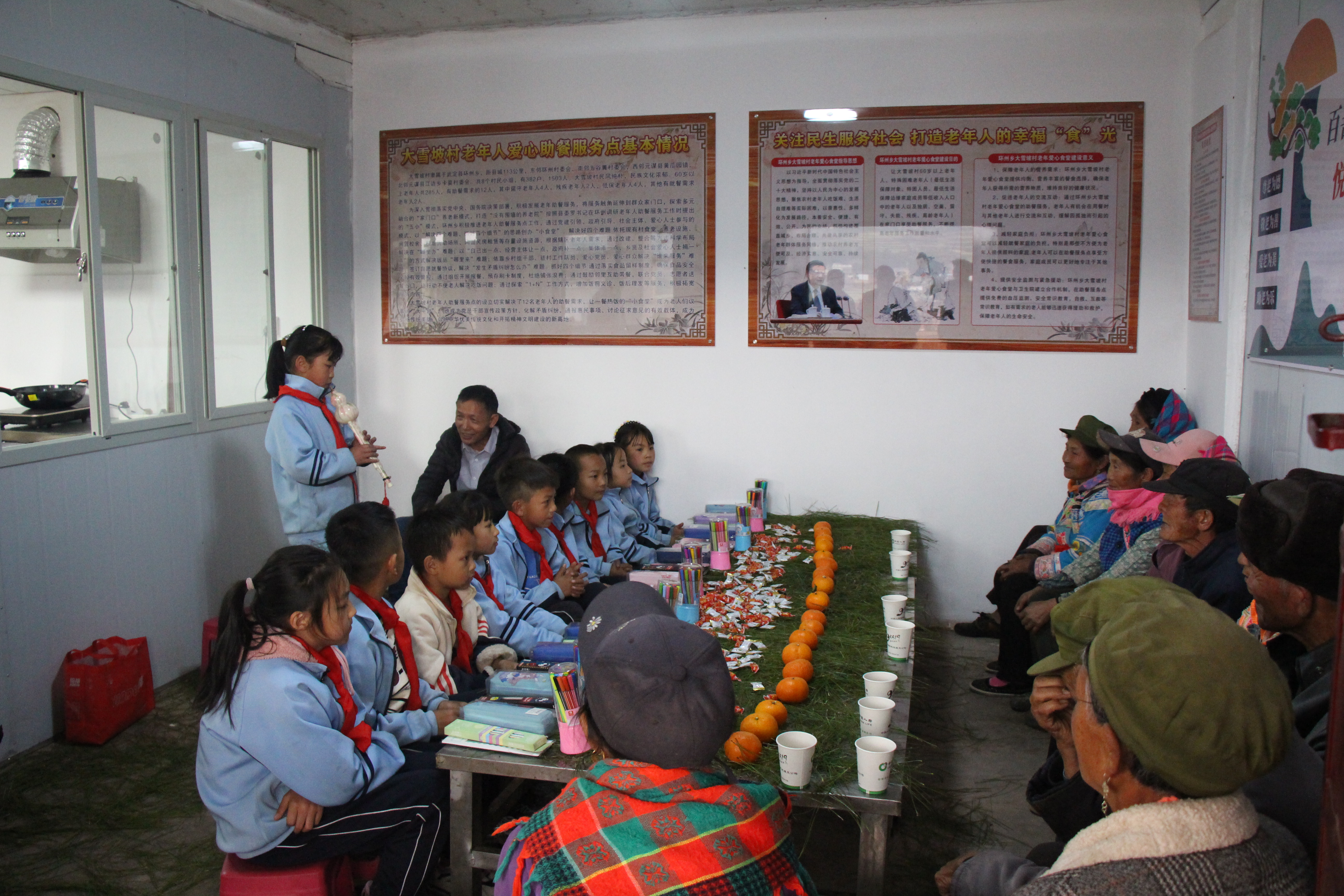 多份温馨。在第一批报名参加老年爱心助餐服务点的11位老年朋友中有一名行动不便老人由村民政协理员普嘉义按时送餐上门;在关爱老年朋友的同时大雪坡村也将本辖区10名留守儿童纳入老年爱心助餐服务点由村干部、驻村工作队、乡村教师开展结对帮扶活动,逢年过节,食堂还会组织留守儿童与老年人共同包饺子、做汤圆等活动,丰富“一老一小”生活让他们感受到家的温馨;乡村教师普春联听说大雪坡老年爱心助餐服务点开业,主动找到村委会想献出一份爱心,为留守、高龄老人、留守儿童开展义剪、大雪坡村乡贤、返乡青年、退休干部、党员群众……纷纷在“爱心食堂”开业当天捐钱捐物,有的给老人带被子、有的给学生带文具、有的给食堂带油、带米。