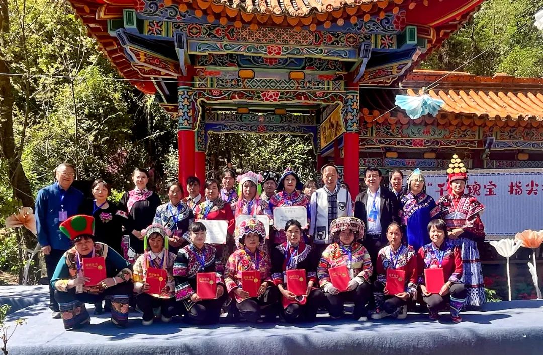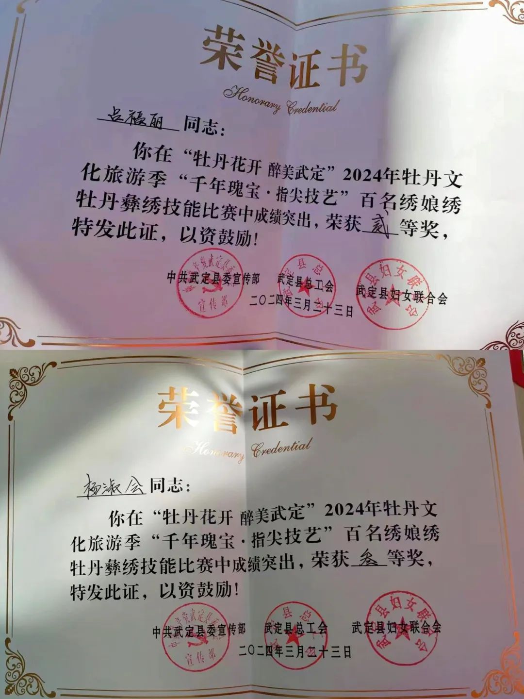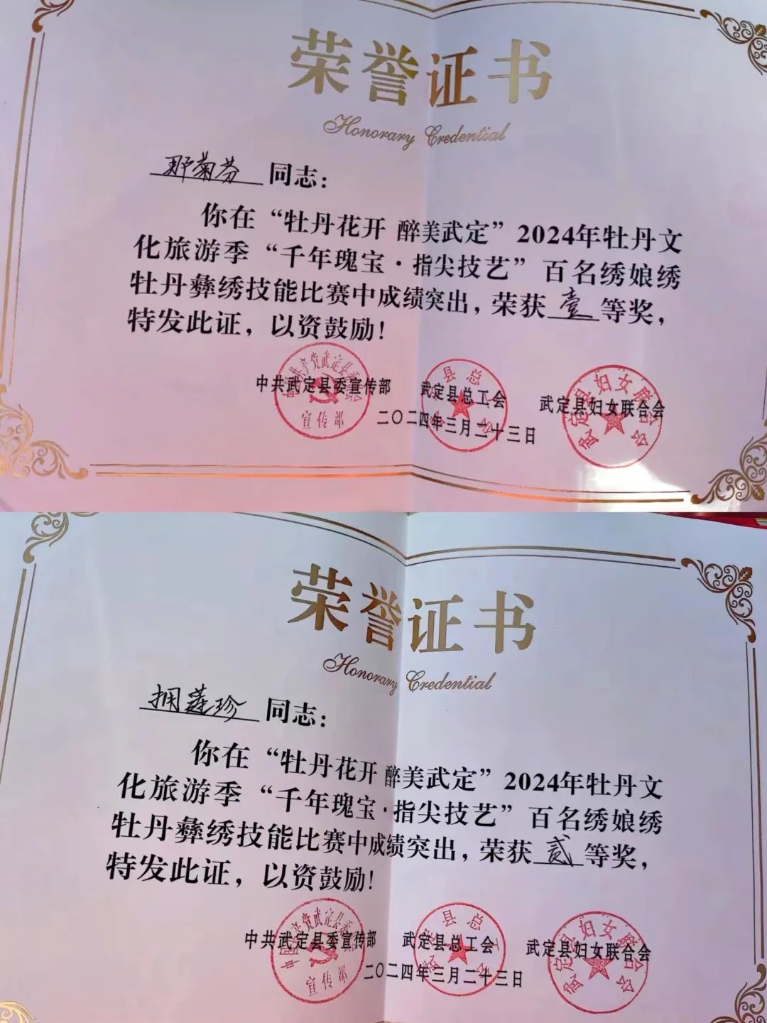 3月3日至12日,发窝乡成功举办了为期10天的2024年“绣”出花样新生活民族刺绣创业培训班,来自发窝乡12个村委会的80余名刺绣爱好者参加培训,此次参加百名绣娘绣牡丹彝绣技能大赛的14名绣娘就出自其中。“往年我也参加过县上组织的比赛,但都没有拿过第一名。这次参加比赛前有幸得到国家级非遗传承人普玉珍老师的倾囊相授,让我对色彩搭配、针法技艺的把控有了明显的提高,终于拿到了一等奖。”那菊芬激动地向大家展示着一等奖的证书。