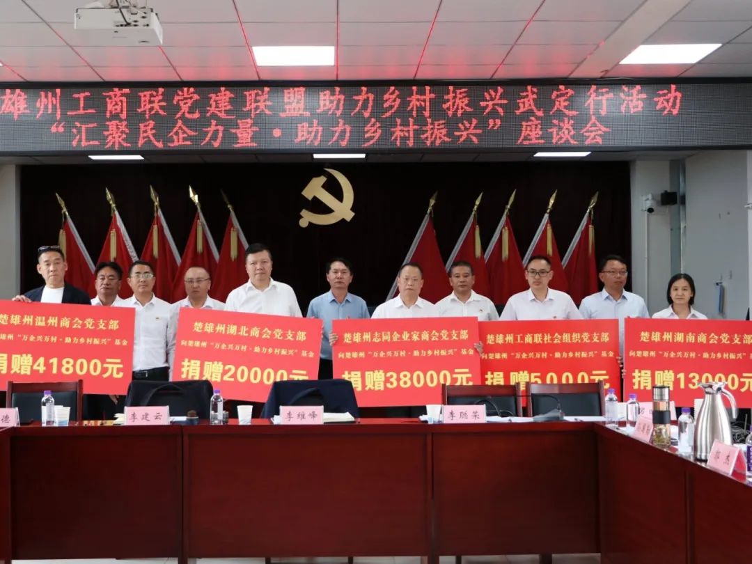 会议期间,组织开展了党建联盟助力乡村振兴捐赠活动,州工商联社会组织党支部、温州商会党支部、湖北商会党支部、湖南商会党支部、志同商会党支部5家州直属商会及云南爱尔发生物技术股份有限公司、恒业文化旅游开发集团有限公司、德昌矿业有限公司、楚悦商业管理有限公司4家州工商联副主席、副会长企业向武定县11个乡镇捐赠资金、物资等共计33万元。