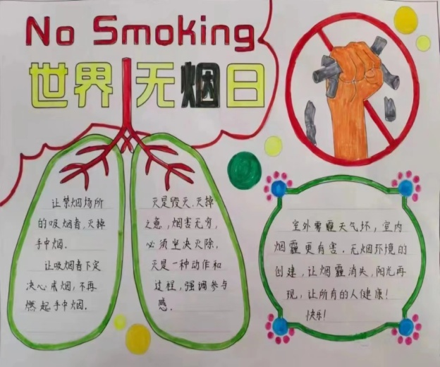 “绘”在纸上,“记”在心间。开展了世界无烟日主题手抄报活动,从世界无烟日的由来、烟草与危害、戒烟的好处、如何科学戒烟等方面入手,图文并茂地展示了烟草与身心健康的科普知识。同学们通过绘画手抄报活动,提升自我健康保护意识,全面了解吸烟的危害,营造一个健康、清洁、无烟的良好校园环境。