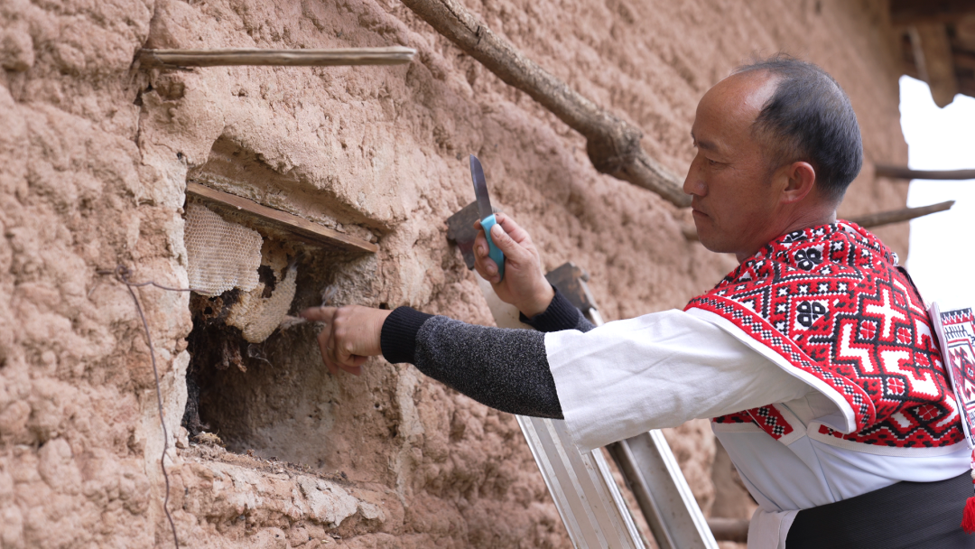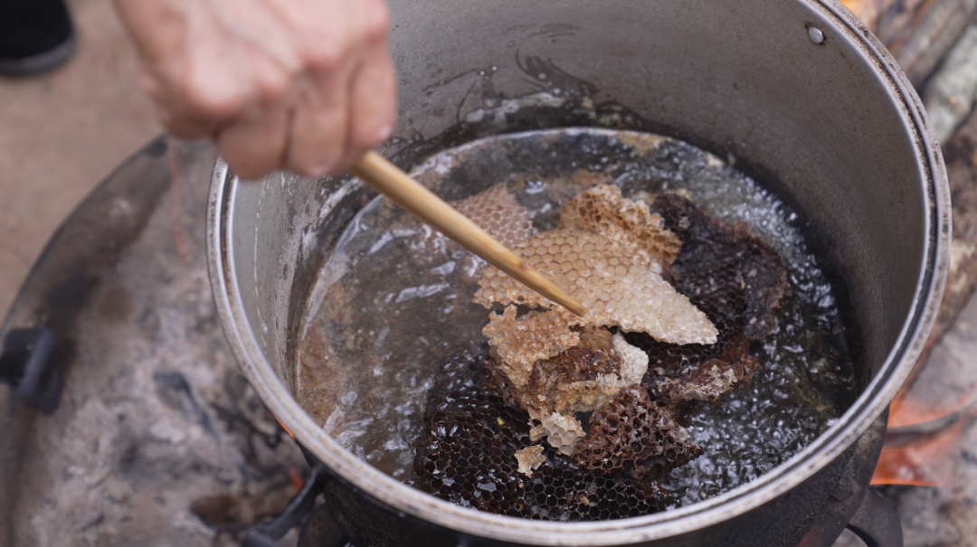发窝乡自期村委会黑虎山村村民 王学光:要做蜡染的最基础的一步就是要做蜡,首先我们需要找到自养的蜜蜂蜂巢,选好备用且干净的无蜜蜂巢,用少许清水煮开,等蜂巢与水完全溶解后,用纱布包好过滤,用力挤压,最好借助工具,使蜂巢里的纯蜂油虑出后,放到清水里,等冷却后捞出拧成团,放到所需的容器里加热溶解,冷却后把它切成块状,蜡就做好了。