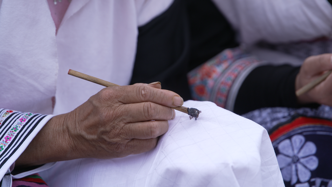 制好的蜂蜡需要放到阴凉的地方保存好,等到点蜡的时候再取出使用。在点蜡前,手艺人们要先在准备好的白色棉布上绘制出自己喜欢的图样。苗族服饰上的图案通常源自日常生活中的事物,多以花草植物,圆形、方形、菱形等几何图形为主,寓意着苗族人民对美好生活的向往和追求。