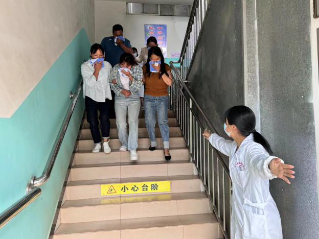 下午1:50,开始组织医务人员在门诊大楼进行了消防安全疏散演练。在紧急疏散的过程中,严格按照“湿毛巾捂住口鼻、弯腰、靠墙走”的逃生要领,快速地撤离火灾现场,到达指定开阔地点。疏散引导组引导患者和家属捂鼻低头弯腰贴墙快速有序向安全区域撤离。